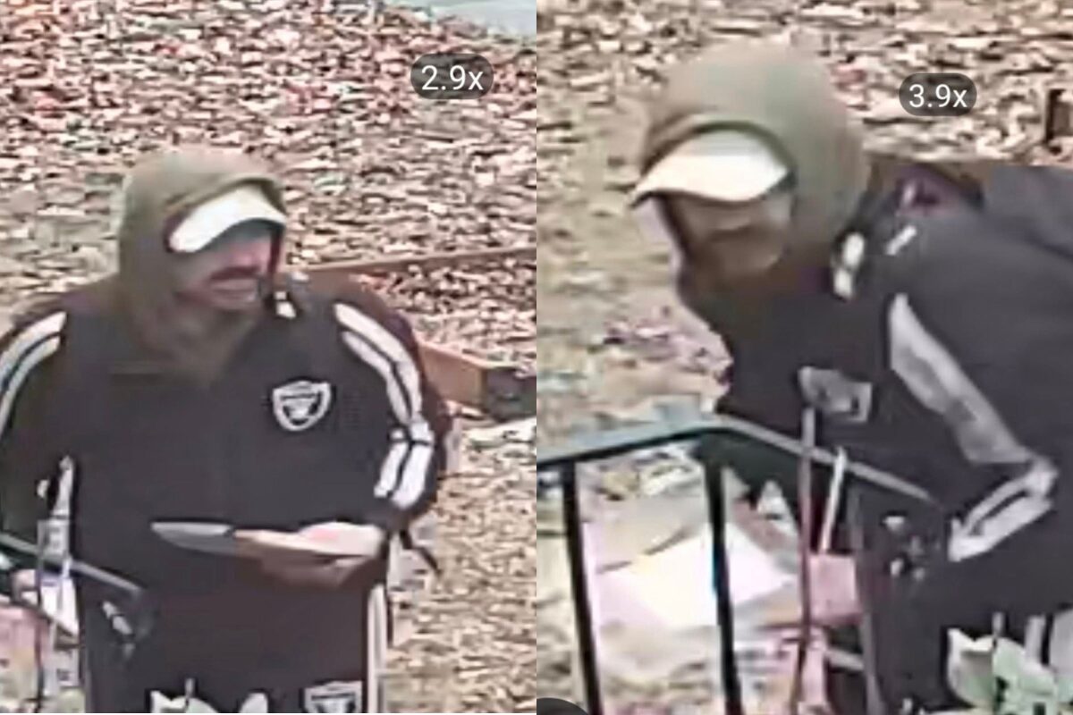 A bearded man wearing a dark jacket was caught on camera stealing packages from a porch in the 800 block of Grove Street.