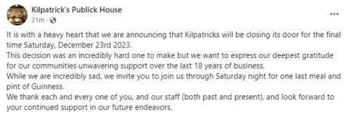 Kilpatrick’s Publick House will permanently close its doors this Saturday night. Ownership made the announcement on the pub’s Facebook page Tuesday, calling it ‘an incredibly hard decision to make.’ Known for its Irish fare and Thursday night karaoke parties, Kilpatrick’s was in business for more than 18 years near the Ithaca Commons.